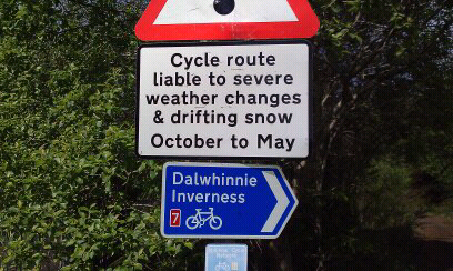 The Jekyll and Hyde weather of Scotland continues. The day began badly with the discovery of a puncture, and Tim having to have his pedals replaced (NOTE Stuart).A long slow climb up to the Pass of Dromochter see picture. All along the pass a cold wind brought showers of rain and sleet (well it felt like sleet) that chilled us all to the bone. Another puncture coming off the pass, complicated by a substandard innertube replacement which exploded. Desperate huddles in a transport stop for coffee and pies to warm us up. Then back into the wind and rain to get lunch in Kinggussie, never have fish and chips tasted so good. By now the wind was behind us and we were descending. Of course the sun then came out as we rode along the valley of the Spey (flooded). Good views across the valley. Very glad to get in to the Hotel at the Boat of Garten. This is turning into a survival course.